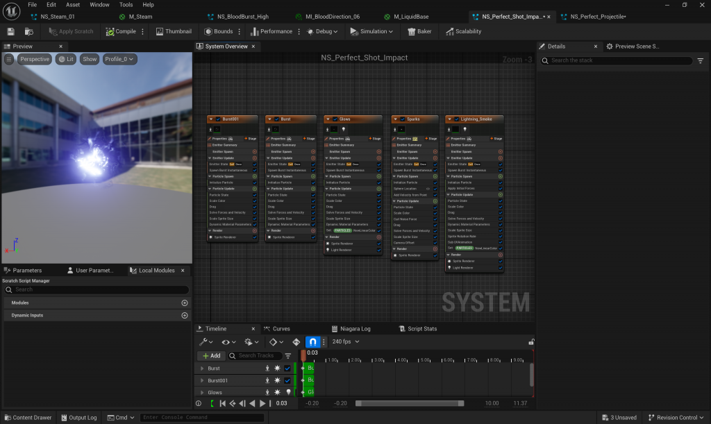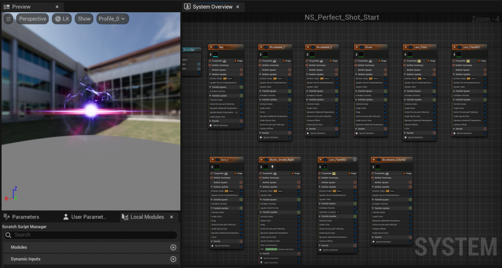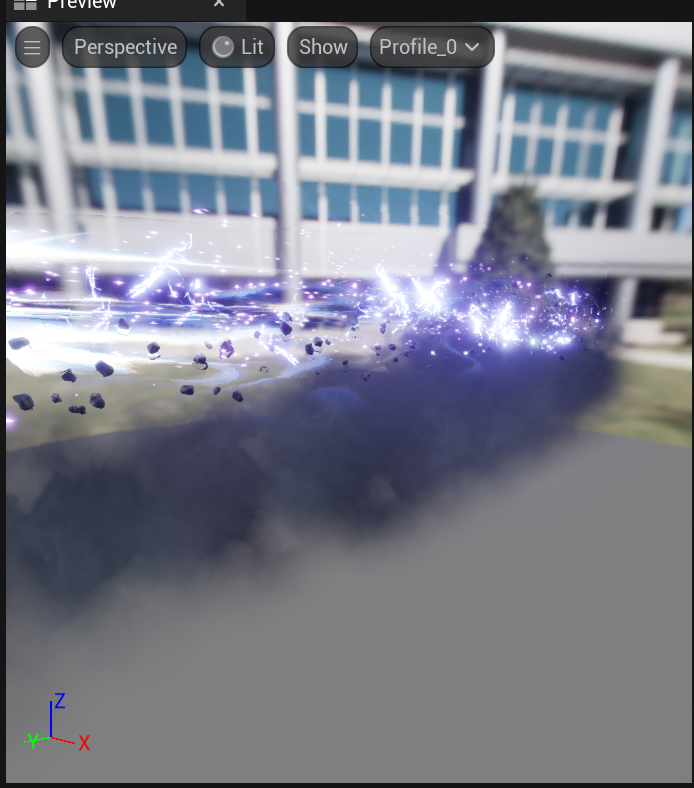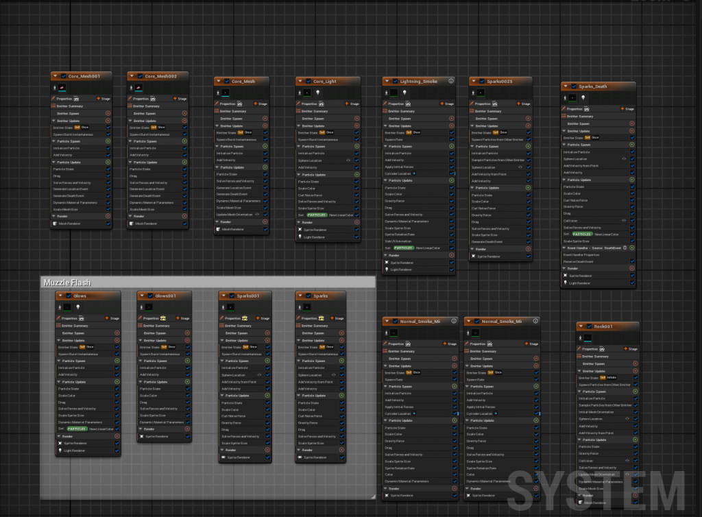 The shooting sparks and laser are the most complex part of the Niagara system. It consists of three emitters, namely the main laser, energy particles, and halo. The main laser is composed of a beam ribbon emitter. By attaching corresponding materials to the emitting surface, a theme laser column is created. At the same time, meshes are emitted in the direction of speed to carry stones, and smoke and lightning are emitted to enhance the overall layering of the main body.