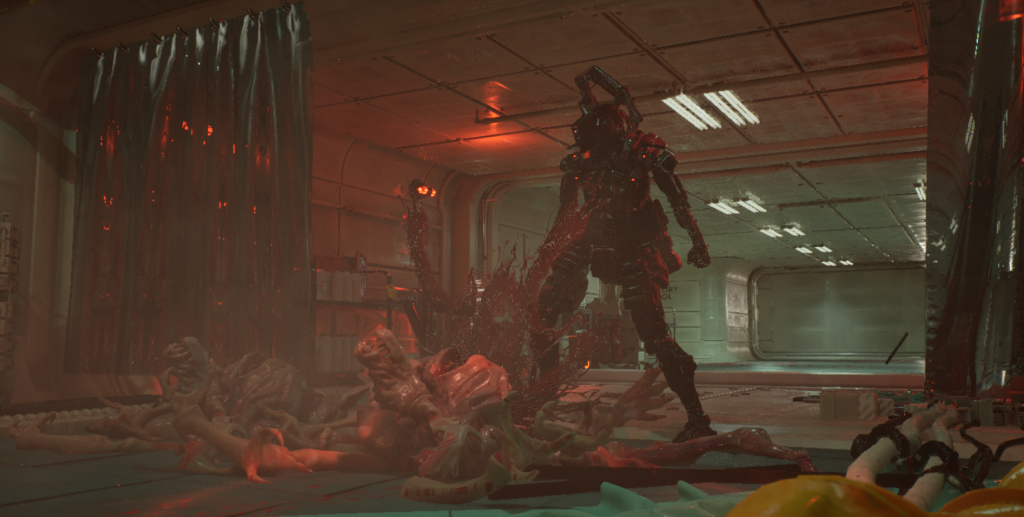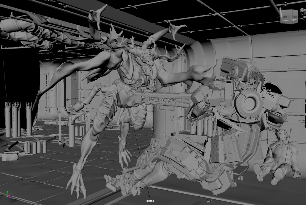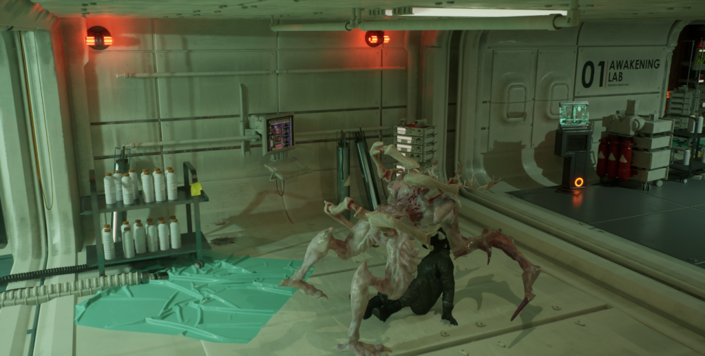 When creating this scene, I referred to some film scenes where humans faced powerful predators, such as in movies like “Alien”. The purpose of this scene is to showcase the brutal hunting instinct of No. 1942, as well as to highlight the overwhelming superiority of Nullifier over humans and its subsequent elimination by Nullifier, thereby emphasizing Nullifier’s power. Behind this shot, the combat part begins.