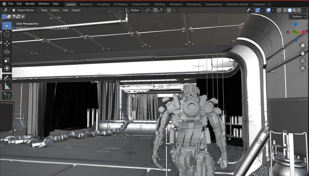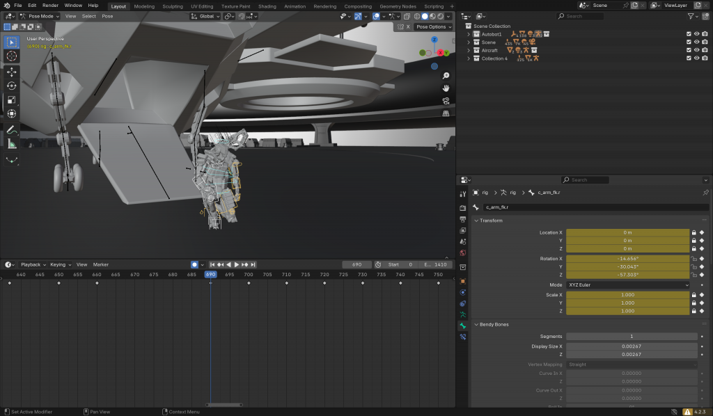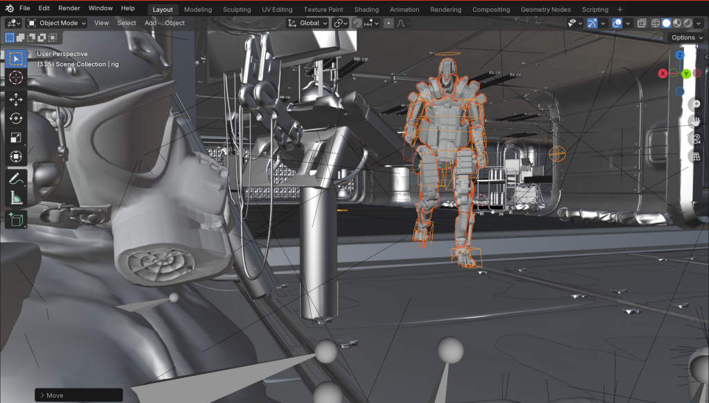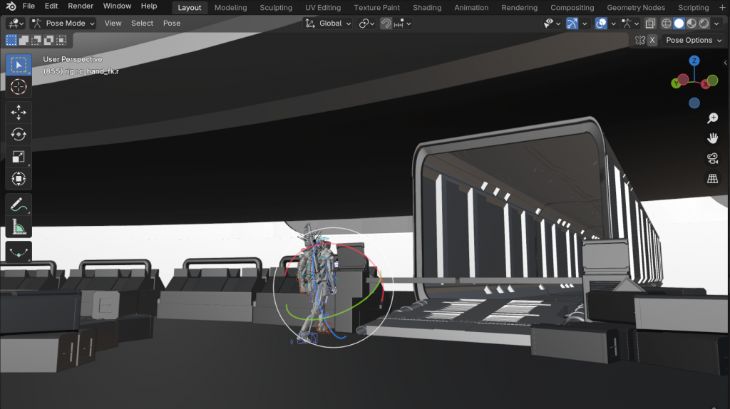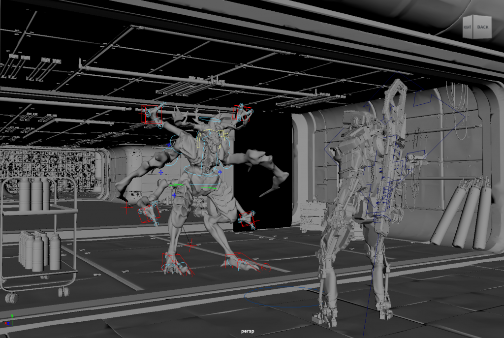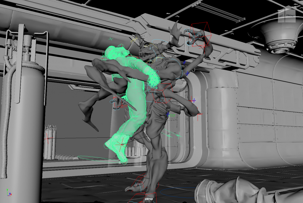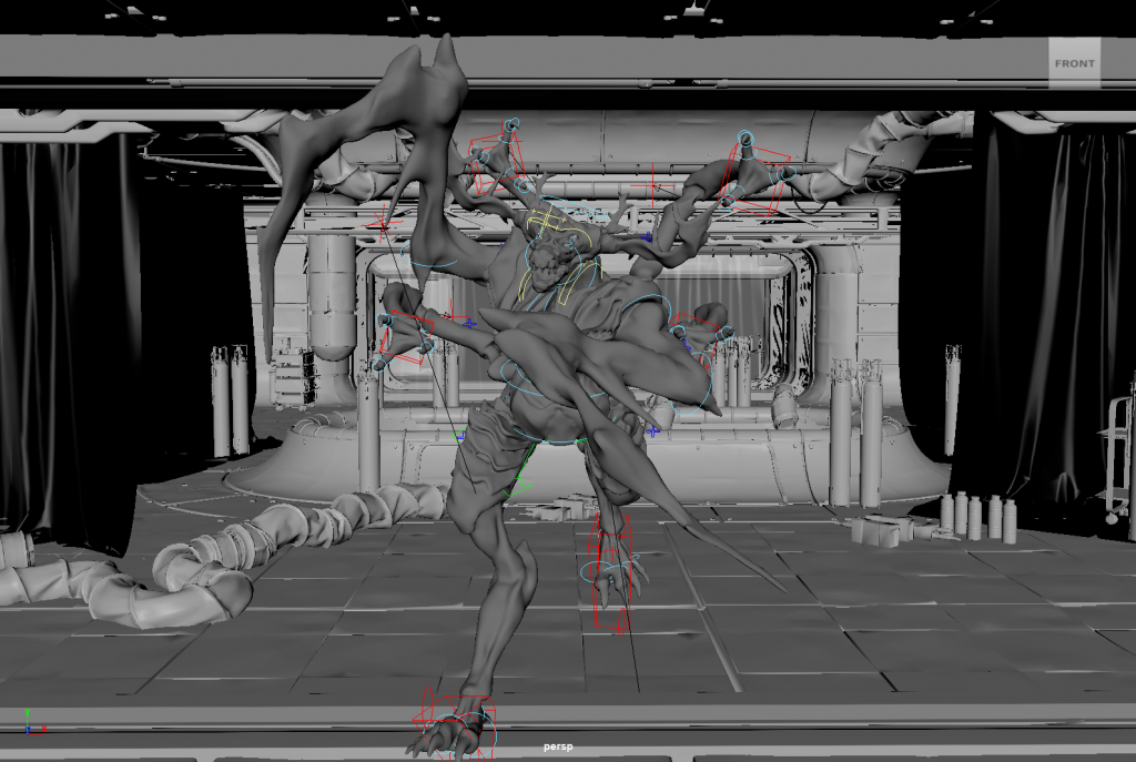 Firstly, it’s the workflow. Unlike previous projects, since the robot was rigged in Blender and the monster was rigged in Maya, during the process of makting the fighting animation, I need to constantly synchronize the animations of the two characters by exporting and importing FBX animations between different software. At first, this workflow was very painful for me. The frequent import and export of animations to adjust was definitely not as easy as real-time adjustment. But after I got used to the “preview” approach, which means image the next motion of the characters in my mind, I found that this workflow could also be relatively efficient because the characters are independent. It is nothing more than adding a switching software process during the switch of controlling the characters.