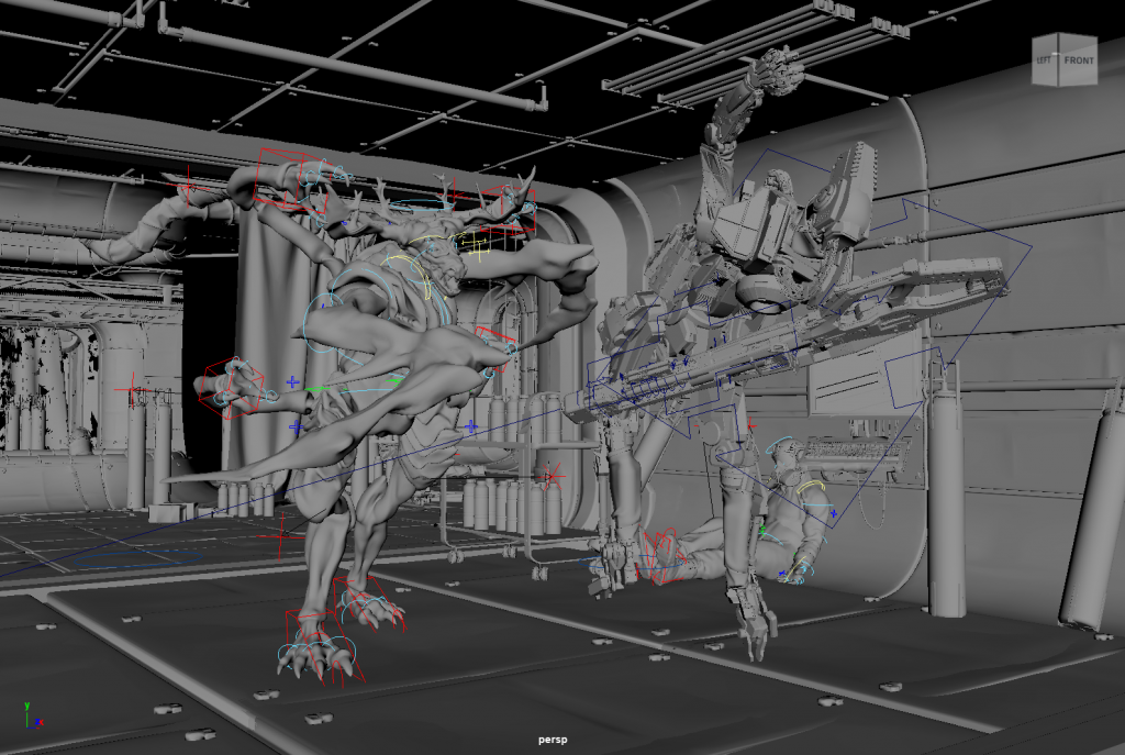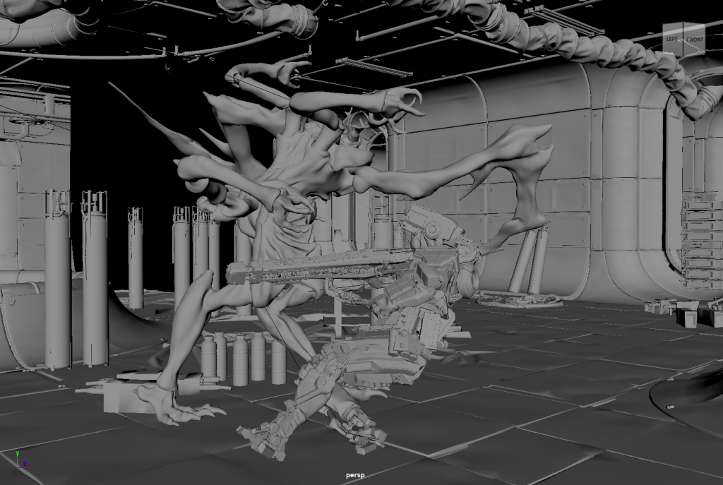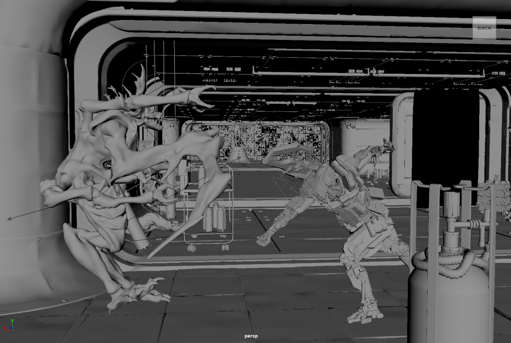 From this scene, the film enters the main fighting sequence, which is the part where I need to constantly switch back and forth between Blender and Maya to adjust the animations. The design concept of the entire fight is to show that Nullifier evades the attacks of subject 1942 through acrobatic moves such as somersaults and jumps, highlighting his overwhelming superiority over subject 1942 in terms of combat capabilities. All the battles were merely for the purpose of transmitting the monster’s combat data back to the headquarters. Then, the high-energy weapon Viper would be used to eliminate subject 1942.