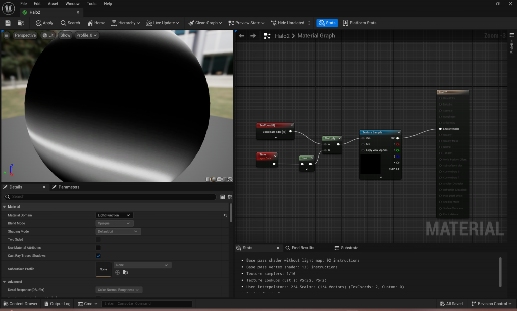 I used a very simple method to create the alarm light. By combining the “time” and “sine” nodes, the black and white mask exhibited periodic movement, and it was linked to the lighting channel to control the light to perform a periodic circular motion, thus creating the effect of the alarm light.
