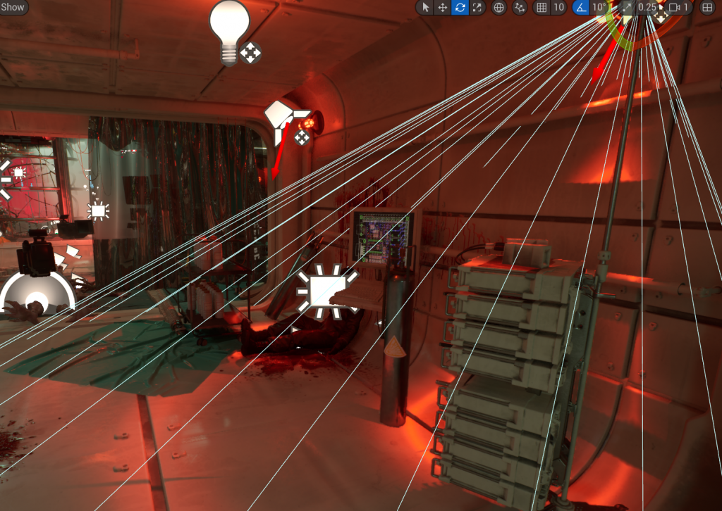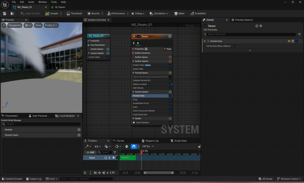 In the lab level, many special effects are created using the Niagara particle system, such as fog, sprayed blood, and laser beams from weapon firings. I will introduce the Niagara system I created and the creation logic of these effects in the following chapters.