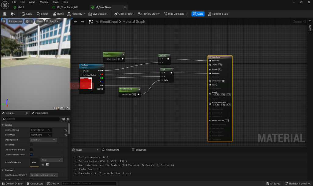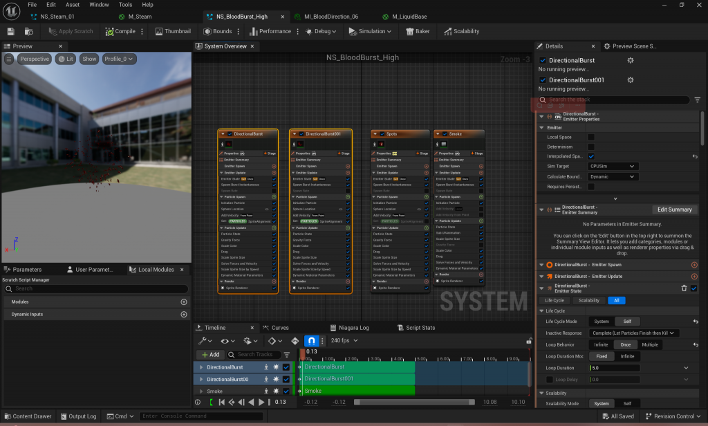 There are two types of bloodstains in the scene. One is the static bloodstain, and the other is the dynamic bloodstain that is sprayed. The former was achieved in the form of decal, while the latter was realized through the Niagara system. In the following VFX section, I will provide a unified introduction to all the Niagara particle systems in the scene.