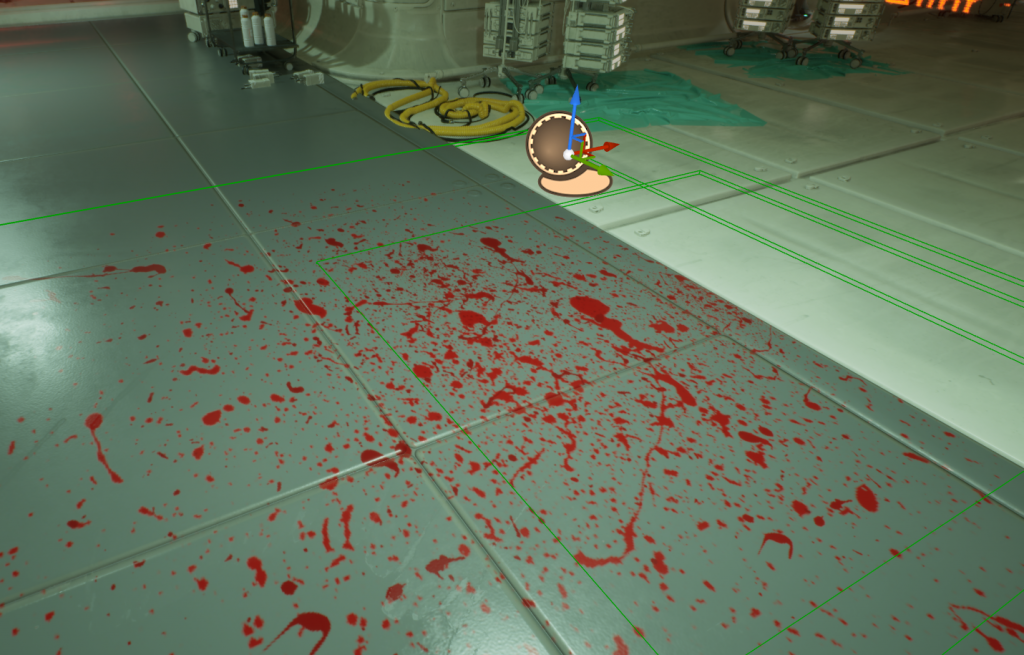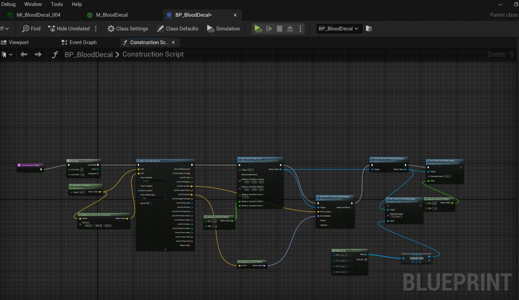 In the static bloodstains, apart from the bloodstains achieved by the decal material, I also used another type of randomly generated bloodstains driven by the blueprint. The basic principle of this is to identify the distance of the projection surface and then randomly create material instances. By adjusting the rotation angle and scaling of the material, a random effect is achieved.