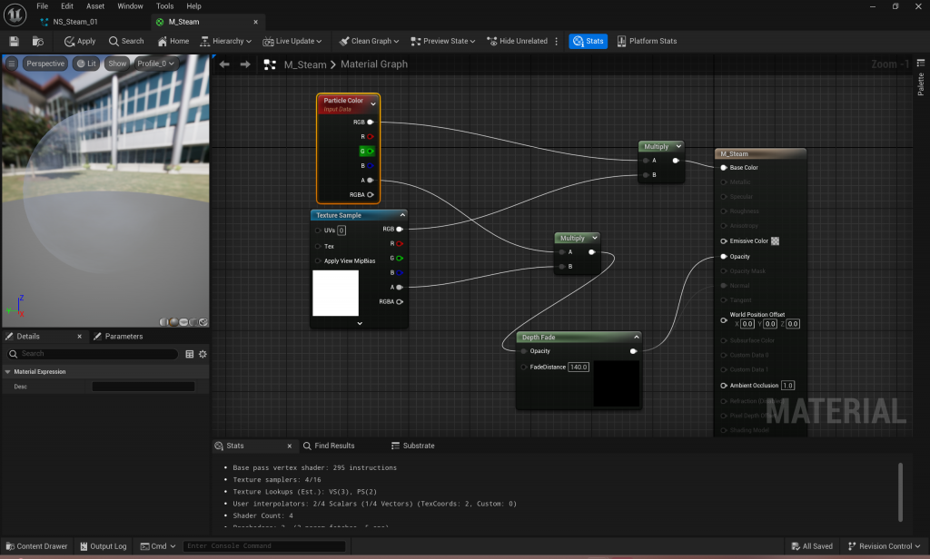 Creating fog in Niagara is very simple; all you need is a continuous emitter. The material of the fog is also quite simple. It is based on particle elements and uses the depth fade node to create an edge-blurring effect to simulate the fog-like texture found in the real world.