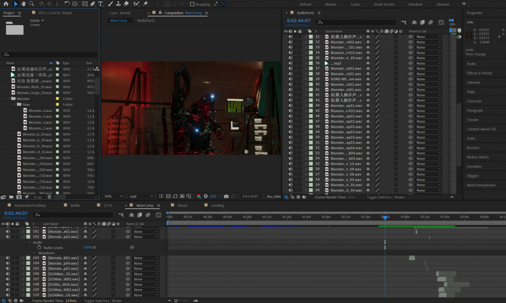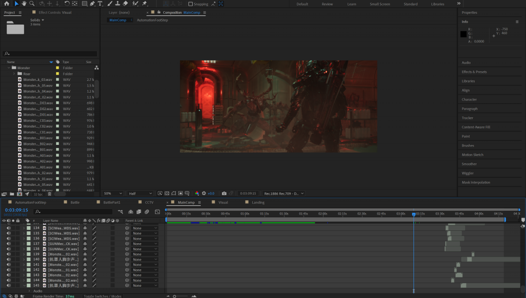In the approximately 4 min 20 s video, I layered about 300 audio tracks, designing sounds for almost every element in the scene, including the two main characters, the aircraft, the laboratory, and the military base. Unfortunately, I have no idea how to design sound effects by my self, so I had to spend a lot of time searching for sound effect resources online, then selecting appropriate sound effects to place at the right time, and adjusting the relative volume between them to control a reasonable listening experience.