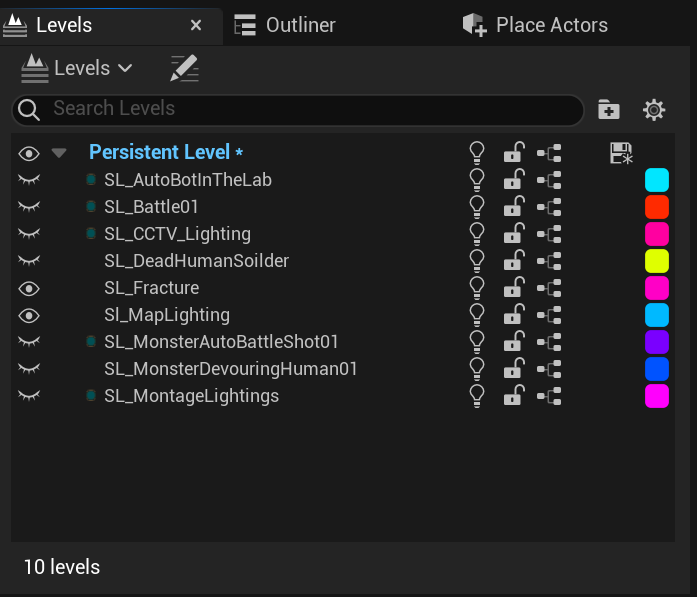 In this map, it is divided into several different periods, and there are also changes in the scene setting and lighting. Therefore, I use “sub level” to manage the changes in scene assets, in order to better distinguish and switch between different shots.